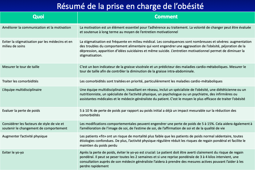 Idéalement, une équipe interdisciplinaire composée du médecin généraliste du patient, d’un médecin spécialiste de l’obésité, d’un diététicien ou nutritionniste, d’un spécialiste de l’activité physique, d’un psychologue ou psychiatre et d’une infirmière s’occupera du patient. Cette équipe doit travailler dans un système de réseau. Les patients peuvent bénéficier de rejoindre un groupe d’entraide si possible.
